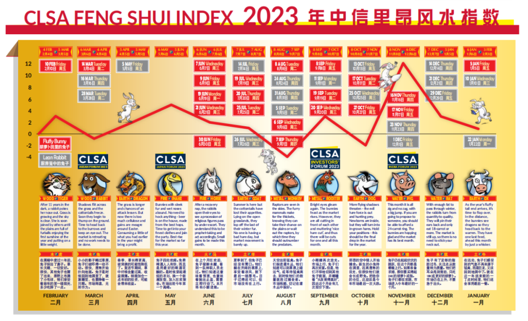1月12日,中信里昂证券发布了一年一度的《恒生指数年度风水指南》。该“胡诌式”指南指出,3月及8月是港股大盘的低点,而11月将是市场最好的一个月。行业方面,癸卯兔年财运最旺的是火系行业,包括石油、天然气、时装和科技,高点出现在春末。