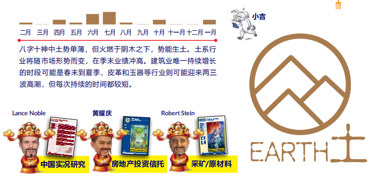 从行业表现来看,中信里昂证券的这份风水指南指出,按风水理论,癸卯兔年财运最旺的是火系行业,包括石油、天然气、时装和科技,高点出现在春末。与之相似,木系行业运势也不错,包括医疗、教育和种植业,高点出现在早春、晚秋和冬季。