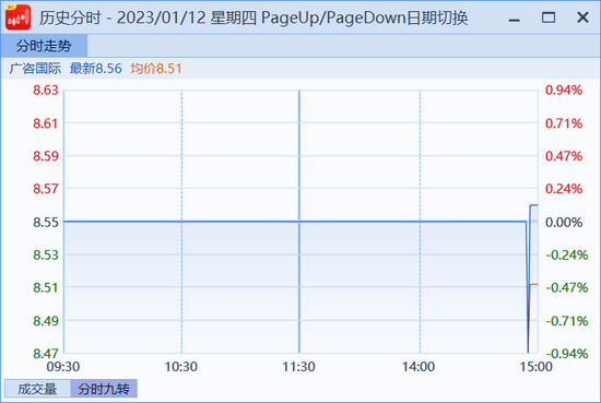 1月12日,北交所A股广咨国际开盘后一直没有成交量。直到收盘前,14点56分成交了两笔100股的买卖单,成交价格为8.47元和8.56元。