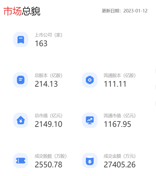 1月12日,北交所成交金额27405.26万元,成交股数2550.78万股,目前上市公司总数量为163家。也就是说,平均163家上市公司日均成交金额为168万元。