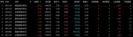 食品饮料、建筑材料、农林牧渔、非银金融、医药生物、家用电器等板块涨幅居前。