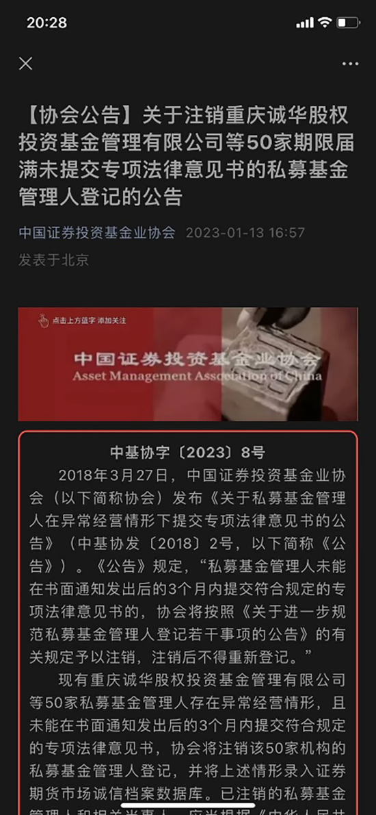 1月13日,中基协发布公告显示,因存在异常经营情形,且未能在书面通知发出后的3个月内提交符合规定的专项法律意见书,50家私募基金将由协会注销。