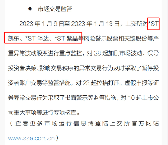 此外,根据《股票上市规则》交易类终止上市程序不设退市整理期。目前*ST凯乐股价已经连续11个交易日低于1元,几乎锁定交易类退市。未来一旦进入交易类终止上市程序,现在盲目跟风未及时清仓的投资者或将被套牢。2023年1月13日晚间,上交所官微直接点名*ST凯乐股票交易情况,表明监管已经关注到公司股价波动。
