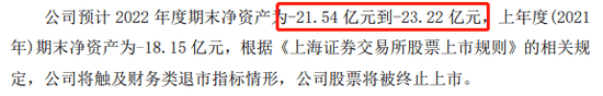2023年1月13日晚间,*ST凯乐披露2022年年报业绩预告。公司预计2022年度期末净资产为-21.54亿元到-23.22亿元。这意味着,2022年年报披露后,公司或将触及财务类退市指标而被终止上市。