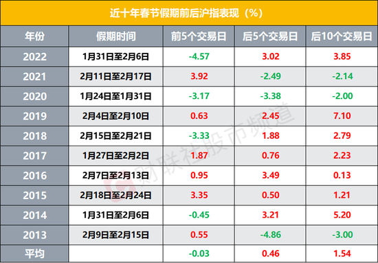 不过,相较于节前行情,春节后的市场“胜率”(上涨概率)相对显得更高。以近十年的上证指数走势来统计,春节前5个交易日期间上涨的概率近6成,而这一数值在节后的5个交易日和节后的10个交易日中达到7成。从近十年涨幅均值来看,沪指节前5日显示微跌,而节后5日显示上涨近0.5%,而在节后的10日行情中,这一数字扩大至1.54%,其中,2019年、2014年两年间,沪指分别录得7.1%、5.2%的涨幅。