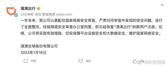 1月16日,@滴滴出行 发布微博称,一年多来,我公司认真配合国家网络安全审查,严肃对待审查中发现的安全问题,进行了全面整改。经报网络安全审查办公室同意,即日起恢复“滴滴出行”的新用户注册。后续,公司将采取有效措施,切实保障平台设施安全和大数据安全,维护国家网络安全。