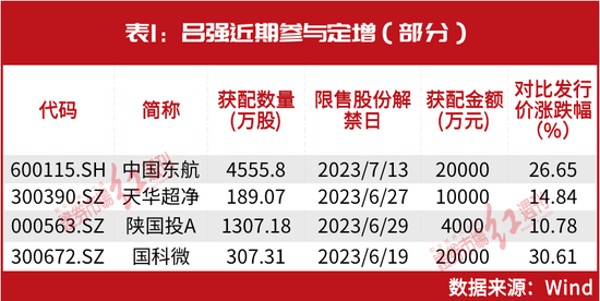 目前来看,吕强参与定增的上述公司均处于浮盈状态,如中国东航目前的收盘价相比发行价上涨26.65%,天华超净、陕国投A上涨超10%,国科微上涨达30%(见表1)。