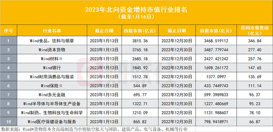 从增持市值来看,今年前10个交易日当中,24个Wind行业悉数获得北向资金不同程度的加仓。1月前半月,北向资金最青睐的Top5行业分别是食品饮料与烟草(346.84亿元)、资本货物(277.40亿元)、材料(257.76亿元)、银行(147.65亿元)、耐用消费品与服装(135.69亿元),加仓市值均在百亿以上。