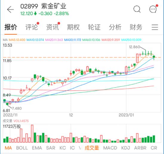 开年一度单日大涨10%的紫金矿业,早盘一度跌近5%,收跌2.88%,仍为年内单日最大跌幅。
