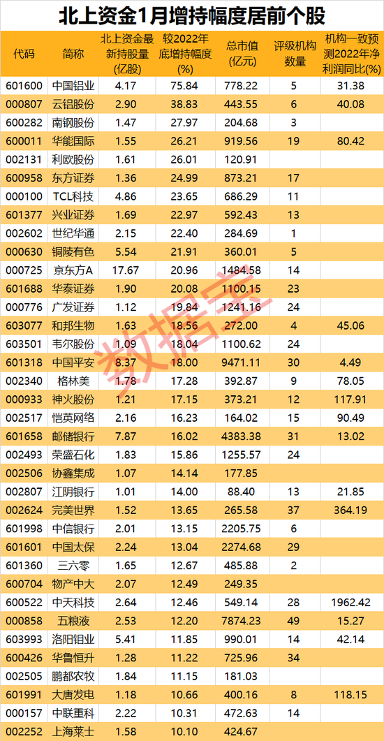 数据宝统计,截至1月16日,相较于2022年12月底的持仓情况,共计36股获北上资金10%以上增持,且最新持股数在1亿股以上。