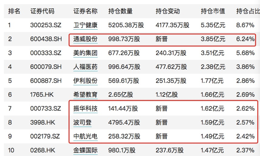 从持仓变动来看,前十大重仓股并不集中,合计持仓比例为29.98%,前十大持仓均获得不同程度加仓,其中通威股份、振华科技、波司登和中航光电新晋前十。被剔除前十的则为分众传媒、宇华教育、恩华医药和海尔智家。