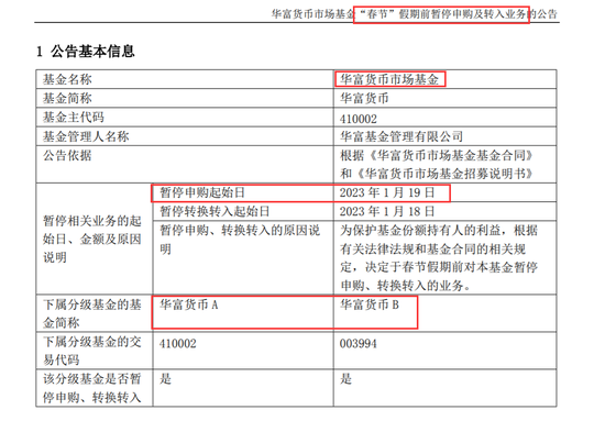 但对基金公司而言,节前大量密集的资金涌入,有可能会影响到基金的平稳运行。因此,为保护原有投资者的收益不被稀释,不少基金公司的货币基金产品针对1月19日进行了限购或暂停申购。比如,中信建投凤凰货币基金18日公告显示,为保护持有人利益,1月19日单日每个基金账户通过代销渠道单笔申购(含定期定额投资)、转换转入或单日每个基金账户通过代销渠道累计申购(含定期定额投资)、转换转入A份额或B份额的金额均不应超过100万元,1月20日起恢复。自1月19日起,华富货币市场基金和长信利息收益货币基金暂停申购业务。