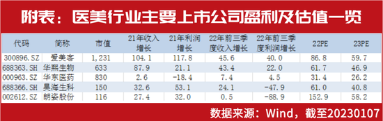 展望2023年,龙头企业跟随行业恢复,收入利润端均会有明显改善,尤其是前期利润端受费用影响压力更大的下游机构;另外,行业经过三年疫情也有明显洗牌,期间龙头表现出韧性,中尾部玩家去产能,后续份额集中的趋势会继续演绎。不过,医美板块整体估值并不便宜,板块龙头股2023年PE接近60倍。