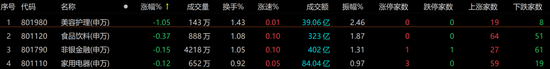 下跌方面,美容护理、食品饮料、非银金融、家用电器跌幅居前。