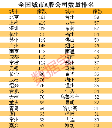 30家A股公司是什么概念?数据宝统计,截至最新,北京、上海、深圳3个城市A股公司数量均超过400家位居前三位,杭州、苏州、广州等7个城市A股公司超过百家。其中,大连、潍坊2个城市A股公司数量为30家,上市公司数量位居全国第39位。