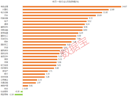 1月以来,A股市场呈现整体修复态势。沪指单边上行,累计收涨5.39%;深成指涨8.94%,创业板指涨近10%。行业近乎全线上涨。汽车、电力设备、计算机、有色金属等行业指数累计涨幅均逾10%,仅商贸零售和社会服务指数小幅回撤。