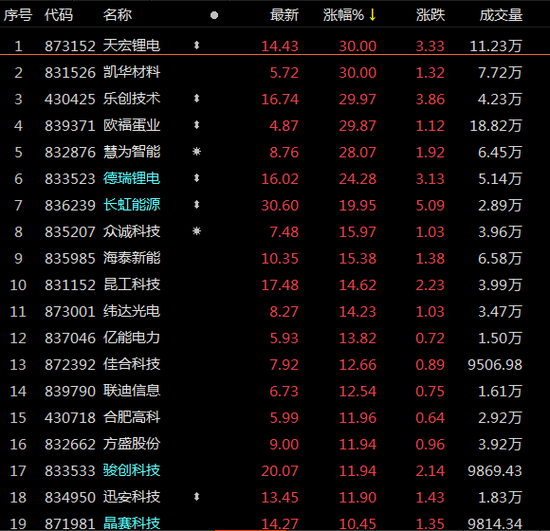 北交所个股亦全线爆发,166只北交所个股无一下跌。其中,天宏锂电、凯华材料、乐创技术、欧福蛋业等四只股票30CM涨停,慧为智能、德瑞锂电涨超20%,长虹能源、众诚科技、纬达光电等近20股涨超10%。