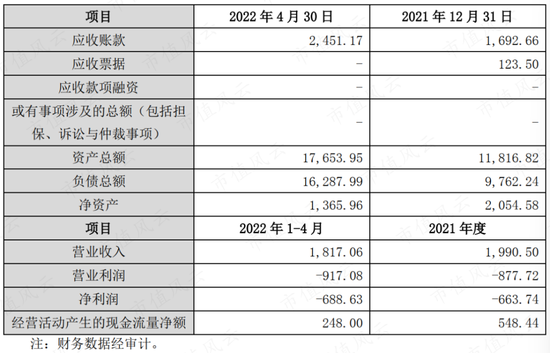 但是,财务数据相当难看,2022年4月末资产负债率高达92%,且收入规模很小,净利润持续亏损。