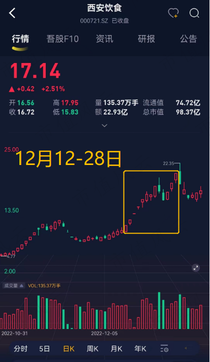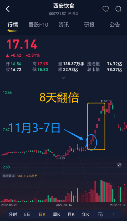 西安饮食第一轮上涨出现在11月3日-14日,在8个交易日内出现7个涨停板,涨幅翻倍。