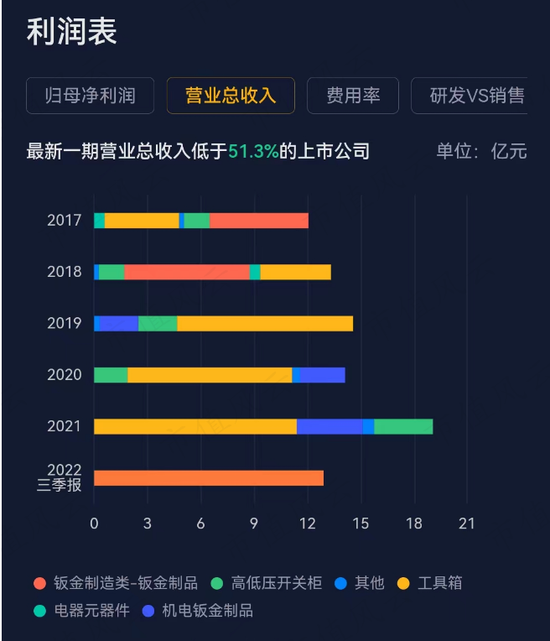 通润装备在2007年上市,主营业务是金属工具箱柜和输配电控制设备,在2021年,工具箱、机电钣金制品和高低压开关柜的营收分别为11.4亿、3.7亿和3.3亿,营收占比分别为59.8%、19.4%和17.4%。