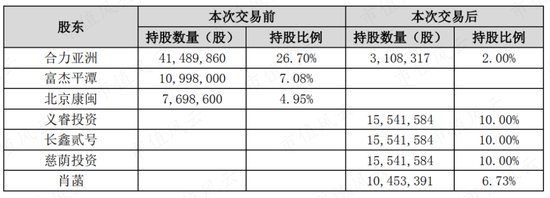 2022年8月1日,公司发布公告,宣布合力亚洲、富杰平潭、北京康闽拟以协议转让的方式向义睿投资、长鑫贰号、慈荫投资、肖菡转让上市公司合计36.73%股份,交易后持股比例如下图: