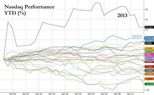 当然,在美国三大股指中,1月涨幅最大的无疑是以科技股为主的纳斯达克综合指数。该指数1月大幅飙升了11%,为2001年1月以来的最佳开局——2001年1月该指数上涨了12%。