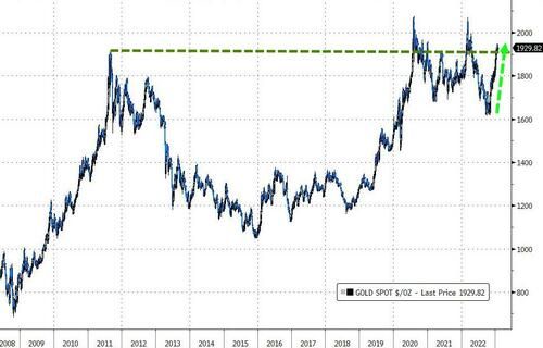 黄金价格目前则已连续第3个月飙升,回到了1900美元以上,刷新了2022年4月以来的最高水平,同时也已明显高于了再之前2011年的高点: