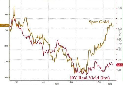 值得贵金属投资者注意的是,黄金眼下已经与实际收益率的走势“渐行渐远”(两者过往呈现负相关)。