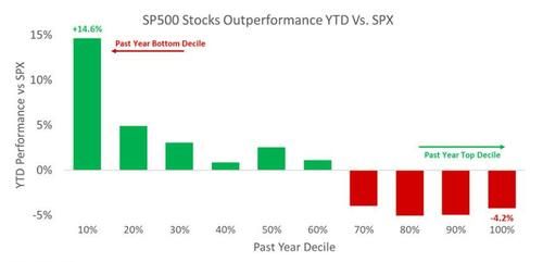 1月美股最具戏剧性之处,或许在于与去年行情间的反差。如下图所示,1月标普500指数中表现最佳的股票,恰恰是那些在去年表现垫底的10%群体。1月份表现最佳的10只个股中有9只在过去12个月中的表现低于标普500指数大盘——这凸显了市场各领域落后与领先群体之间的巨大转换。