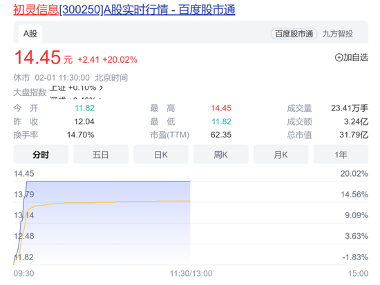 初灵信息昨日刚刚公告,预计2022年度归属于上市公司股东的净亏损0.78亿元—1.17亿元,上年同期为盈利7885.38万元。今日,初灵信息小幅低开后直线拉升,不到8分钟就20%涨停,10分钟成交就超昨日全天成交。