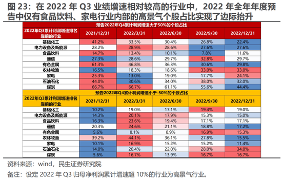 而产业链视角来看,在2022年Q3业绩增速相对较高的行业中,2022年全年年度预告中仅有食品饮料、家电行业内部的高景气个股占比实现了边际抬升(食品饮料从7.8%抬升至11.6%,家电从17.7%抬升至24.1%),考虑到前者低景气个股占比边际持平,后者边际下滑,因此尽管食品饮料与家电披露率整体不高,然而我们对其最终业绩表现相较于Q3进一步改善可以适当乐观;而电力设备与新能源、农林牧渔的高景气个股占比边际持平(分别为27.6%与33.0%),低景气个股占比均出现下滑,这一定程度上也意味着板块景气向上的驱动力并没有出现明显变化;相较之下,尽管上游(有色金属、煤炭、石油石化)高景气个股占比相较2022年Q3均出现边际下滑,然而数值上均仍在30%以上,进一步表明在需求走弱的环境中板块的景气韧性。