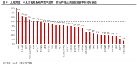 分行业来看,上游板块中煤炭、有色金属、石油石化预喜率排名分别排名第一、第二与第九,数值分别为72%、62%与47%;而中游材料与装备制造板块中,电力设备及新能源、机械、基础化工预喜率均高于50%,排名同样靠前(分别为第4,5,6);相较之下,下游消费板块中仅有家电、农林牧渔、汽车预喜率排名相对靠前(分别为第3、第7,第10,数值为60%、50%、45%);而TMT板块中仅有通信预喜率排名前十(数值为48%,排名第8)。