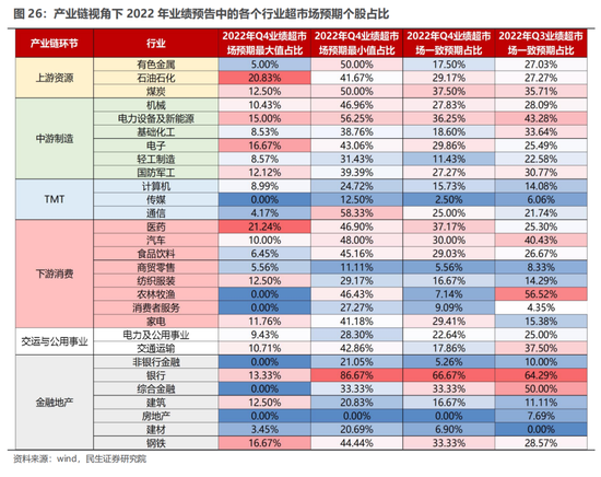 而从产业链视角来看,上游资源品中,有色金属在2022年度业绩预告中超市场一致预期的比重相较2022年Q3出现显著下滑,而石油石化、煤炭的超预期比重不降反增(分别抬升1.89%、1.79%),其中煤炭的业绩超一致预期个股占比仅次于银行,这或许一定程度上表明当前市场对能源的预期差强于金属。而在中游制造环节中,电力设备与新能源依旧是超预期个股占比最高的行业,达到36.25%,然而其超预期的难度正在不断加大(相较2022年Q3出现了明显下滑);而电子仅为业绩表现依然低迷,然而却成为了唯一超市场一致预期个股占比边际抬升的行业(从25.49%抬升至29.86%),市场预期偏向过于悲观,这一定程度上解释了为何电子行业年初至今的股价表现(强势)与业绩基本面(羸弱)的背离。同样在TMT中,尽管对于计算机而言,依然有大量个股不及市场最低预期,然而其超市场一致预期的个股占比却相较于Q3出现了一定抬升,行业的悲观预期正在逐渐得到修正;相较之下,通信景气度的改善力度似乎更具备预期差:在接近60%的个股都超过市场最低预期的同时也有25%的个股超市场的一致预期。而对于下游消费链而言,医药与家电行业在2022年Q4超一致预期的比例分别达到37.17%与29.41%,相较2022年Q3抬升分别11.87%与14.03%,排在一致预期占比抬升力度最大的行业前两名(其中医药行业甚至有21.24%的个股超市场预期的最大值),存在明显的预期差。相较之下,汽车、农林牧渔的超预期占比分别下滑10.43%、49.38%,市场预期差大幅收敛。而在金融地产链中,银行依然是唯一超市场一致预期个股占比大于60%的行业,并且相较于2022年Q3仍实现边际抬升,可以认为市场对经济下行中银行板块的业绩韧性存在明显低估。