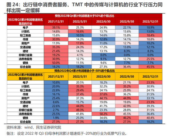 而在2022年Q3的弱景气行业中,地产链(房地产、钢铁、建材)尽管在年度预告中弱景气个股占比依然处于高位(分别为33.1%,40.4%,39.3%),处于所有行业前三名,然而相较Q3均出现了不同程度的下滑,这或许一定程度上也意味着虽然板块仍然低迷,但是也处于艰难企稳的进程中。与此同时,出行链中消费者服务、TMT中的传媒与计算机的行业下行压力同样出现一定缓解。相较之下,电子、交通运输、非银金融的弱景气个股占比进一步抬升(分别达到23.3%,23.3%,31.5%),这或许意味着板块在2022年Q4的业绩下行压力依然巨大。