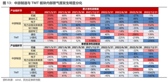 同样景气度分化的现象还发生在TMT之中,通信在经历了2021年的低迷后,2022年迎来显著复苏,全年业绩增速达138.54%;相较之下,传媒与计算机则依然受损严重,全年业绩下滑200%以上。