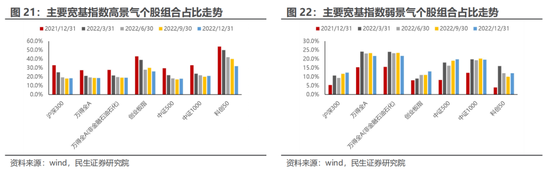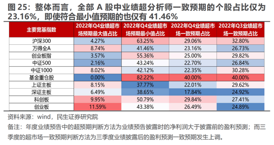 从宽基指数视角来看,基金重仓股指数是唯一成分股中高于市场一致预期的个股占比不低于40%的指数,与2022年Q3整体持平,其中高于最大预期/一致预期/最小值预期的比重分别为0%/40.0%/82.2%。