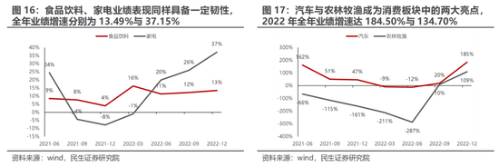 而在下游消费板块中,出行链中的航空机场依然受损较为严重,消费者服务、商贸零售则延续2022年下半年以来企稳回升的表现。食品饮料、家电业绩表现同样具备一定韧性,全年业绩增速分别为13.49%与37.15%。相较之下,汽车与农林牧渔成为消费板块中的两大亮点,2022年全年业绩达184.50%与134.70%。