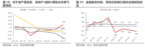 对于地产链而言,房地产/建材/钢铁全年景气度低迷,行业预喜率普遍低于20%,业绩增速均小于-50%,考虑到产业链整体披露率并不低,业绩表征意义较强,地产链仍处于至暗时刻。而金融板块内部,同样仅有银行相对业绩韧性较足。