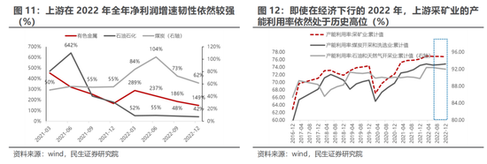 从产业链视角来看,上游依然具备较强的业绩韧性,在宏观景气度显著下行的2022年,煤炭/石油石化/有色金属全年净利润增速分别为61.64%/148.74%/42.39%。考虑到板块较高的业绩披露率,我们认为即使在2021年高基数的“拖累”下,上游依然有望成为2022年全年景气相对占优的环节。我们在此前多篇报告中均提到,基于传统经济周期中认为经济下行环境中上游景气度往往受损严重的认知范式在本轮周期中已然失效,供给端的长期约束与冗余产能不足将大幅平滑上游资源景气的周期性波动,使其一定程度上具备了“经济下行周期中高韧性,而经济上行周期中高弹性”的特性。