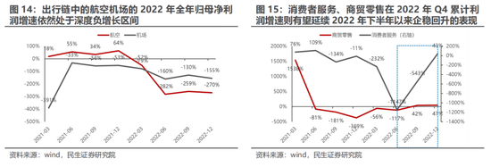 我们以已披露业绩预告与快报的2665家上市公司为分析样本:整体来看,在2021年Q4低基数效应下,全部A股在2022年全年净利润增速为13.64%,相较于2022年Q3显著抬升。事实上,与宏观经济联系更为密切的沪深300在2022年Q4业绩累计增速仅为12.22%,相较2022年Q3边际下滑3.15%,并且从单季度视角来看,沪深300在低基数效应并不明显的情况下,2022年Q4增速仅为0.88%,为2022年以来新低,这与宏观经济的弱势表现基本一致。从产业链视角来看,上游依然具备较强的业绩韧性,在宏观景气度显著下行的2022年,煤炭/石油石化/有色金属全年净利润增速分别为61.64%/148.74%/42.39%。而在中游制造环节,景气度出现显著分化:电力设备与新能源、基础化工的2022年全年业绩增速分别为152.24%与43.06%,处于相对高位;相较之下,国防军工、机械设备、电子、轻工等业绩表现则相对不佳,全年录得负向增长。对于下游消费板块而言,业绩亮点主要集中于汽车与农林牧渔,2022年全年业绩达184.50%与134.70%。而在金融地产链中,地产链的景气度持续低迷,而银行则展现出一定的业绩稳定性。