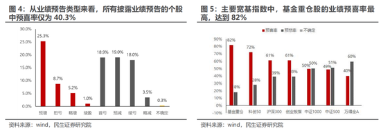 从业绩预告类型来看,所有披露业绩预告的个股中预喜率仅为40.3%(具体包括预增,扭亏,略增,续盈四种类型),预悲率达59.3%(具体包括首亏,预减,续亏,略减四个类型)。主要宽基指数中,基金重仓股的业绩预喜率最高,达到82%,展现出相对稳健的盈利能力,而科创50、沪深300与创业板指预喜率均超60%;除此以外其他指数均不足50%。