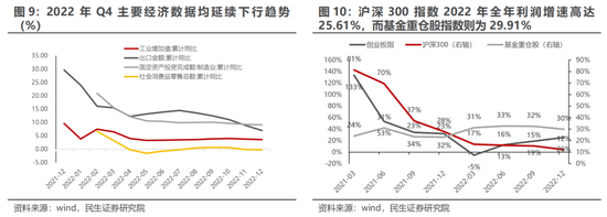 事实上,与宏观经济联系更为密切的沪深300在2022年Q4业绩累计增速仅为12.22%,相较2022年Q3边际下滑3.15%,并且从单季度视角来看,沪深300在低基数效应并不明显的情况下,2022年Q4增速仅为0.88%,为2022年Q4以来的新低,这与宏观经济的弱势表现基本一致。而对于披露率相对较高,业绩代表性较强的创业板指与预喜率较高的基金重仓股指数而言,前者2022年全年利润增速高达25.61%,主流宽基指数中仅次于科创50与基金重仓股(代表性弱于创业板指),连续四个季度实现边际改善;而后者则为29.91%,尽管年内首次低于30%,相较Q3弱下滑2.55%,整体依然具备一定的盈利韧性。