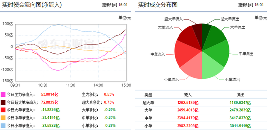 从两市主力资金流向来看,截止收盘,沪深两市主力资金呈现小幅净流入状态,两市共流出53.0014亿元。其中,超大单净流入72.8839亿元,大单净流出19.8826亿,中单净流出23.4191亿元,小单净流出29.5822亿元。