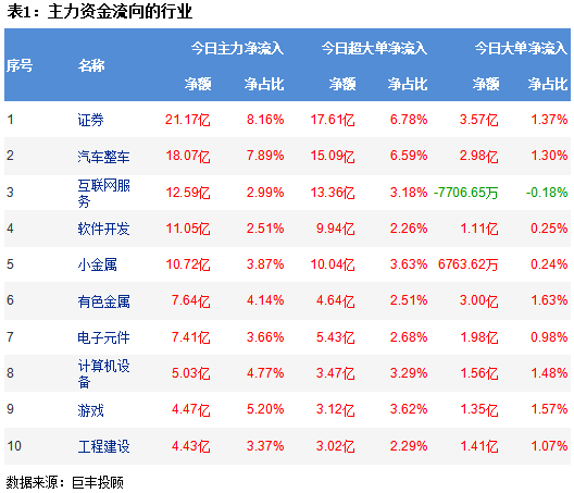 从两市行业板块资金流向来看,证券板块获主力资金净流入21.17亿,汽车板块获主力资金净流入18.07亿,互联网板块主力资金净流入12.59亿,软件开发板块主力资金净流入11.05亿,小金属板块主力净流入10.72亿。