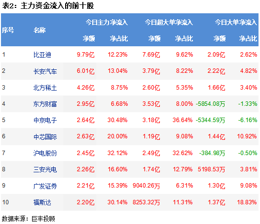从两市个股主力资金流向来看,比亚迪获主力资金净流入9.79亿,长安汽车获主力资金6.01亿净流入,北方稀土获主力资金净流入4.26亿,东方财富获主力资金净流入2.95亿,中京电子获主力资金净流入2.64亿。