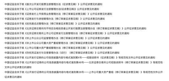 具体看,这次公开征求意见的制度规则包括《首次公开发行股票注册管理办法》等证监会规章及配套的规范性文件,涉及注册制安排、保荐承销、并购重组等方面。沪深证券交易所、全国股转公司(北交所)、中国结算、中证金融等同步就《股票发行上市审核规则》等业务规则向社会公开征求意见。
