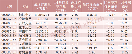 1月份持仓市值减少额居前十的股票中除益丰药房被北向资金加仓438.39万股外,其他股票均被北向资金减仓,其中长江电力、以岭药业、中国核电、保利发展、中国建筑被北向资金减仓超1000万股。