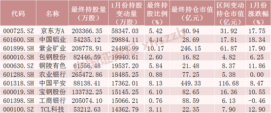 从市场表现来看,1月份北向资金持股增加数居前十的股票中,除农业银行收平、工商银行下跌0.46%外,其他股票均上涨。中国铝业涨幅最大,1月上涨18.34%。