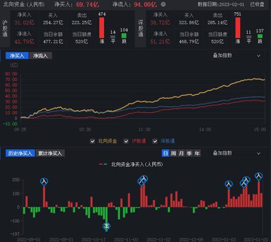 2月1日,A股三大指数均高开,震荡调整后出现持续上扬,中小盘股表现活跃。截至收盘,上证指数涨0.90%报3284.92点;深证成指涨1.31%报12158.19点,创业板指涨1.27%报2613.69点,A股合计成交额10043.67亿元,较前一交易日增长11.61%,北向资金净买入69.74亿元,这是北向资金连续第16个交易日净买入,合计净买入1489.06亿元。总体上看,A股个股涨多跌少,有4361只上涨,610只下跌。