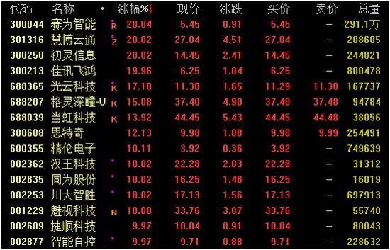 近日站上风口的人工智能概念今日再度爆发,截至收盘,赛为智能、初灵信息、慧博云通、佳讯飞鸿等“20cm”涨停,格灵深瞳涨超15%,汉王科技、同为股份、川大智胜、智能自控等均涨停,海天瑞声涨近10%。